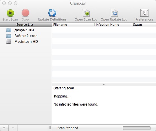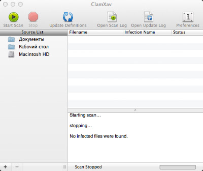 Следующее приложение - ClamXav. Движок используется известный и неплохо себя зарекомендовавший - ClamAV, так что качеству поиска вирусов вполне можно доверять, но вот интерфейс какой-то уж совсем неказистый, хотя и простой.